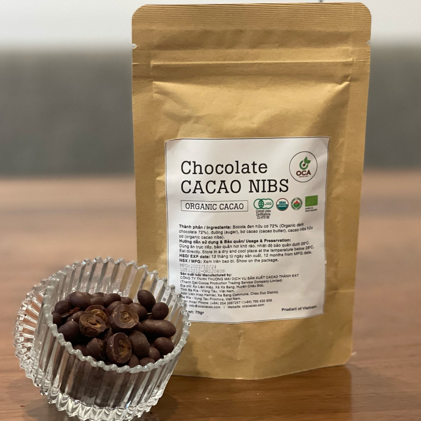 焙煎したカカオニブを、カカオ分62%のダークチョコレートで丁寧にコーティング。