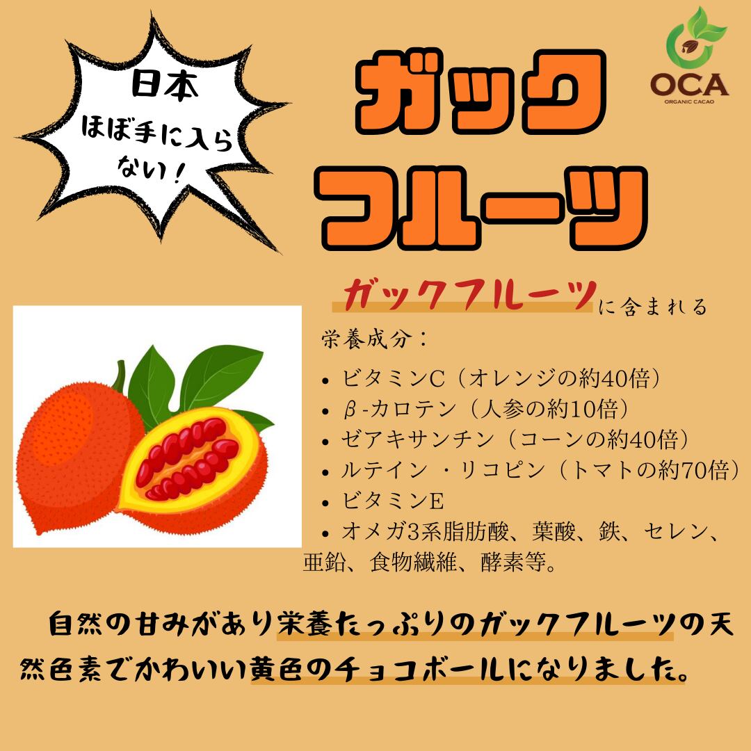 ガックフルーツの魅力とチョコの甘さ、カカオ豆の力強さ。