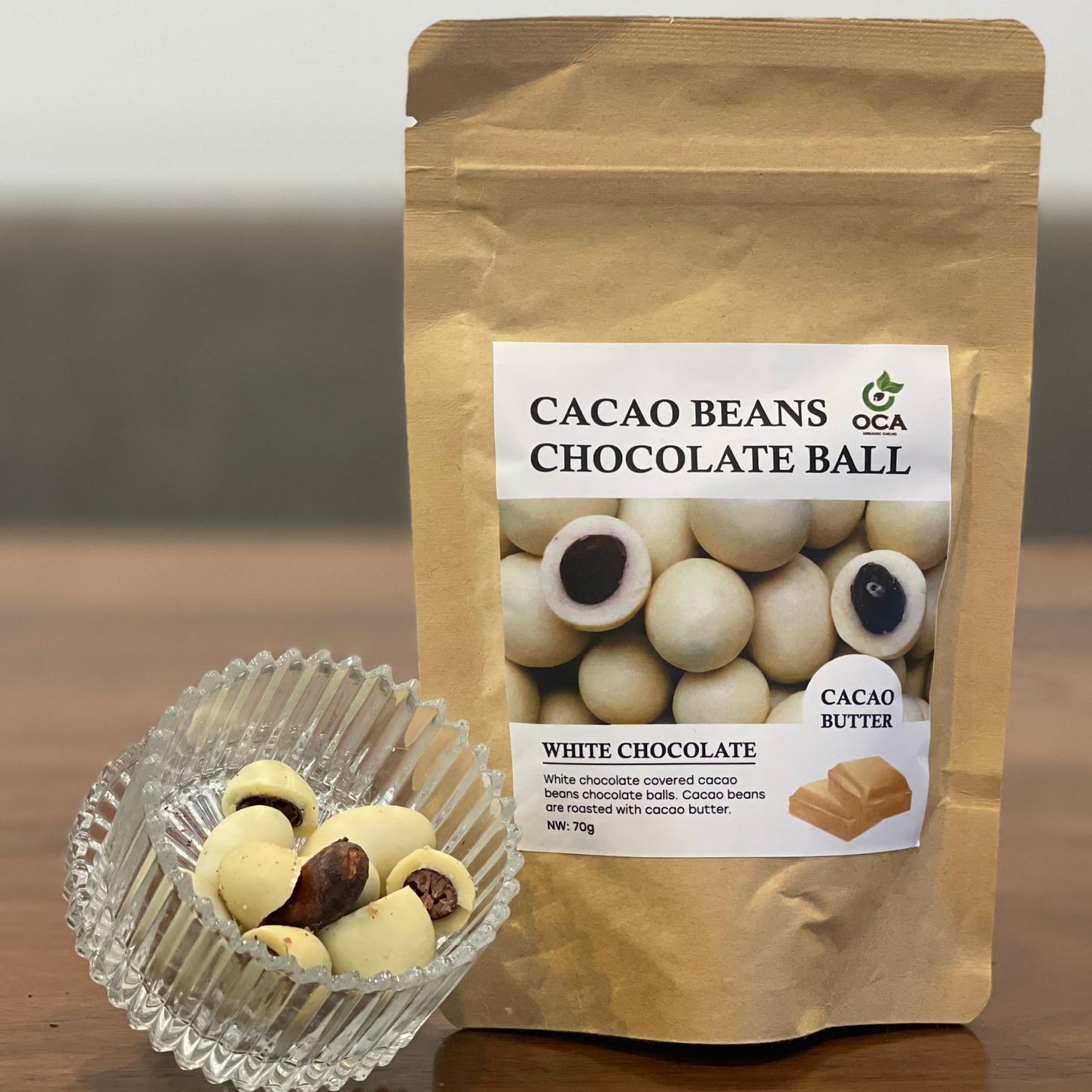 コーティングに使用しているホワイトチョコレートは、脱色、脱臭をしていない自然なままのカカオバター使用なので、ホワイトチョコからも、ほのかなカカオの香りが感じられます。 もちろん、このカカオバターもOCAの農園産。 なるべく余分なことをしないで、自然の風味を残したカカオバターからはカカオらしさが感じられます。