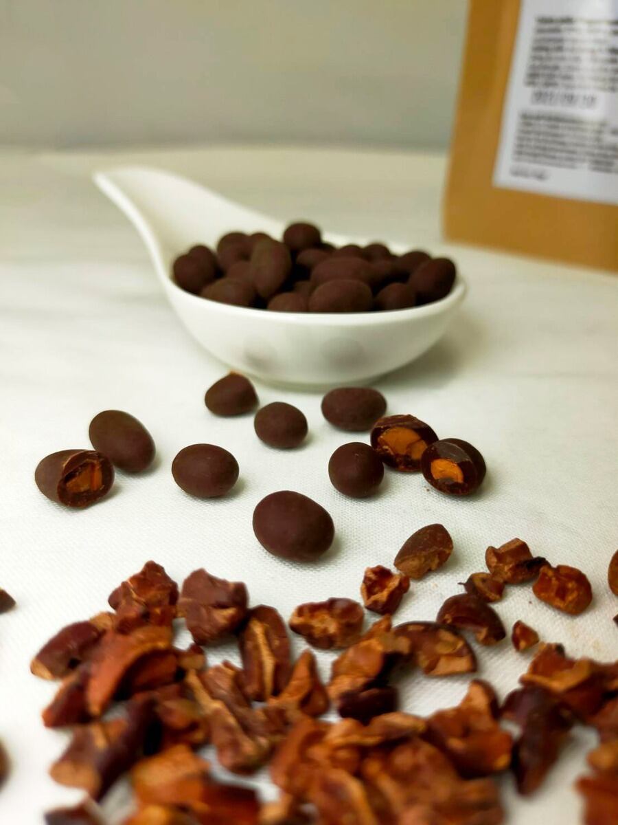 焙煎したカカオニブを、カカオ分62%のダークチョコレートで丁寧にコーティング。